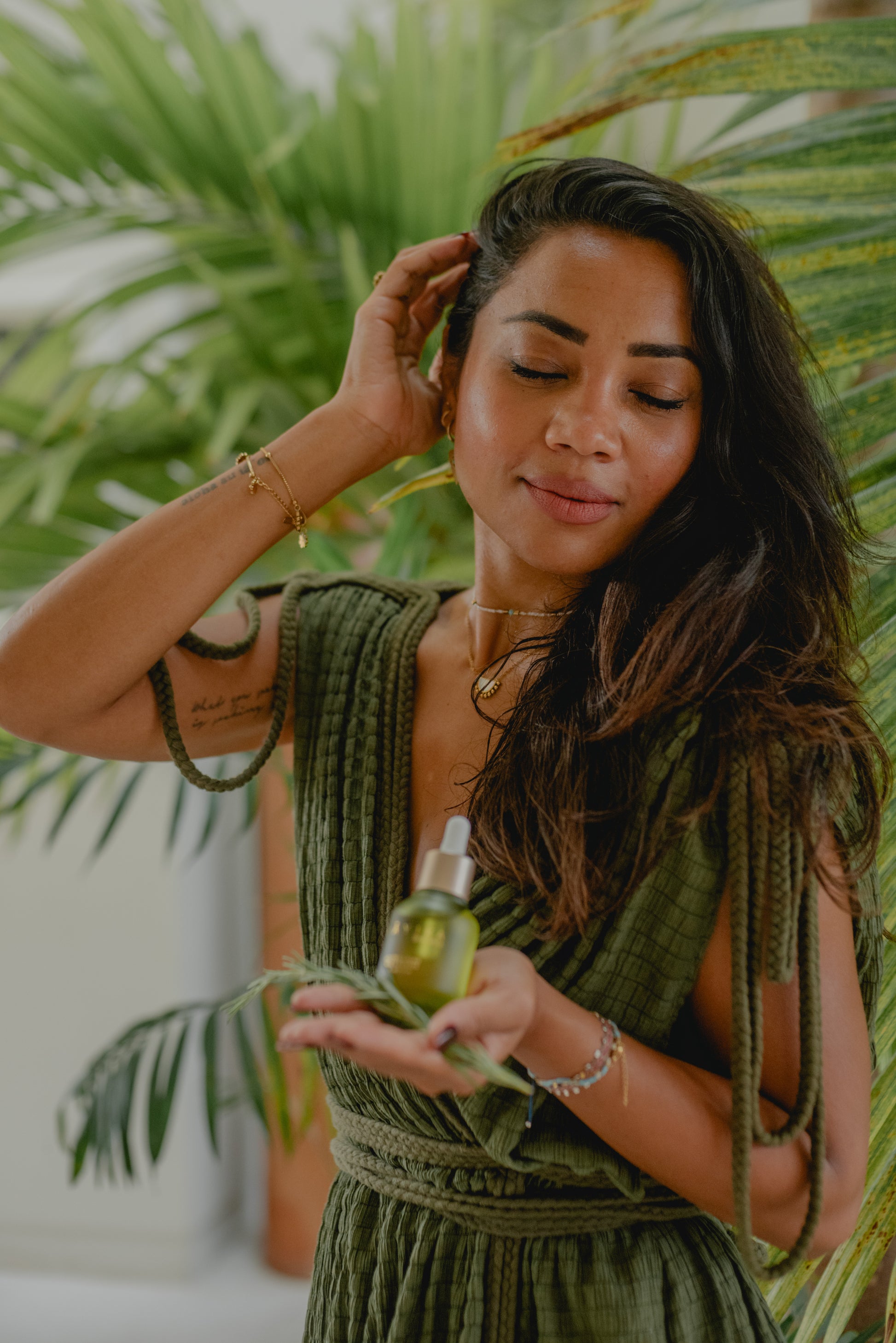 Formulado con aceites de argán, jojoba y semilla de uva, infusionados en jamaica, romero y ortiga todos orgánicos —hierbas conocidas por fortalecer el folículo y estimular la circulación del cuero cabelludo. Enriquecido con aceites esenciales de romero y lavanda, y acompañado de un cuarzo aventurina, piedra de la regeneración y la abundancia.